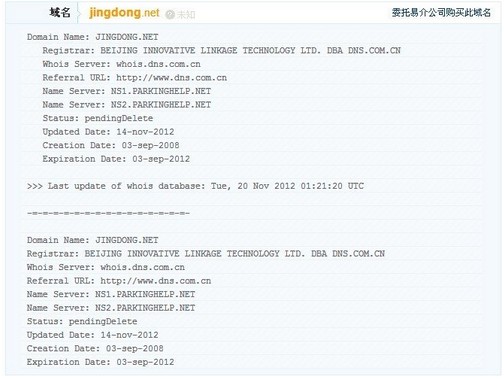 whois信息顯示,jingdong.net注冊于2008年9月,該域名的到期時間為2012年9月,此次域名所有者也是非常大意,畢竟有著“京東”坐鎮(zhèn),jingdong.net的關(guān)注度肯定不會少。
