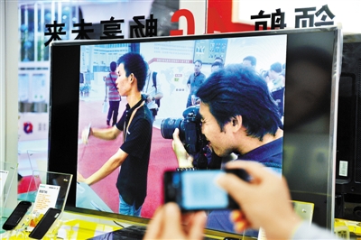 昨天下午,在深圳會展中心第十四屆高交會的4號展館海信公司的展臺前,一位正在拍照的記者被工作人員用手機拍照后馬上上傳到電視屏幕上。記者 李博 攝